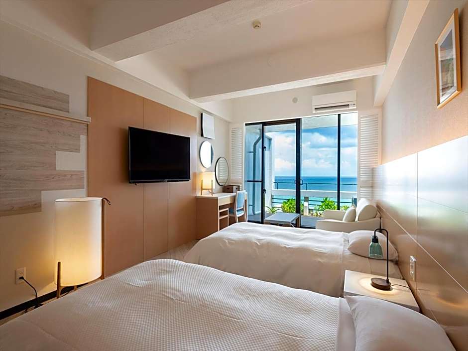 Air-conditioned rooms with Western-style beds and a tatami (woven-straw) seating area. Features ocean views, a flat-screen TV, a fridge, and an electric kettle with green tea bags. The private bathroom comes with a hairdryer and Japanese Yukata robes.